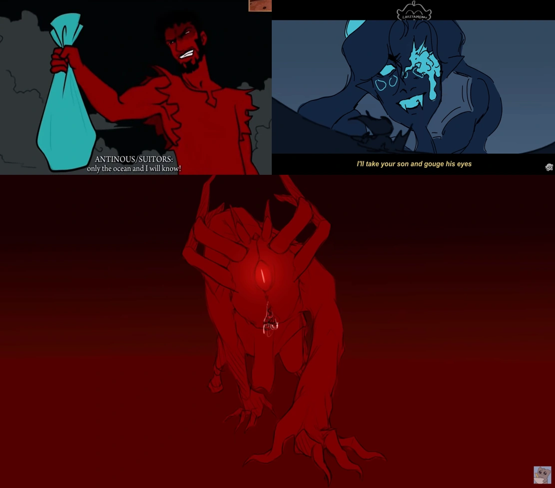Next, he has this whole "ruthlessness is mercy upon ourselves" ideology. Now, I know what y'all are thinking. "But Yomi, this is a traditionally card-carrying trait for a villain to have! How can it prevent him from counting?" Well, hear me out here; EPIC: The Musical is a dark and grim world filled with all sorts of morally gray and questionable characters who really put their emotions and hearts to the side to survive in the cruel world of Ancient Greece due to how many vile and vicious figures are present. Be it protecting someone you love or making a decision for the greater good, it's not always hopeful and optimistic like Polites makes it out to be. However, Ody only commits grey-zoned heinous acts out of orange-and-blue morality since he was extremely hesitant to murder an infant (even living with the guilt for life), had to unwillingly sacrifice six of his men to Zeus to see his wife and son again, and killed the sirens and suitors as they were dangerous, so those acts had understandable and good intentions behind them. As for Poseidon, many of his crimes are motivated by pride and spite as he drowned 540 of Ody's men just for not killing his son and encouraged him to commit suicide or else he would flood Ithaca and kill everyone in the kingdom, including Penelope and Telemachus (both of whom Ody love deeply). So, while ruthlessness is needed in some situations, it's not always warranted and can occasionally backfire and cause problems for oneself, which is what happens with Poseidon as he gets brutally tortured by an angry Ody who nearly throws his ideologies right back in his face if not for the god calling off the storm, albeit for pragmatic reasons. So, not preventing.